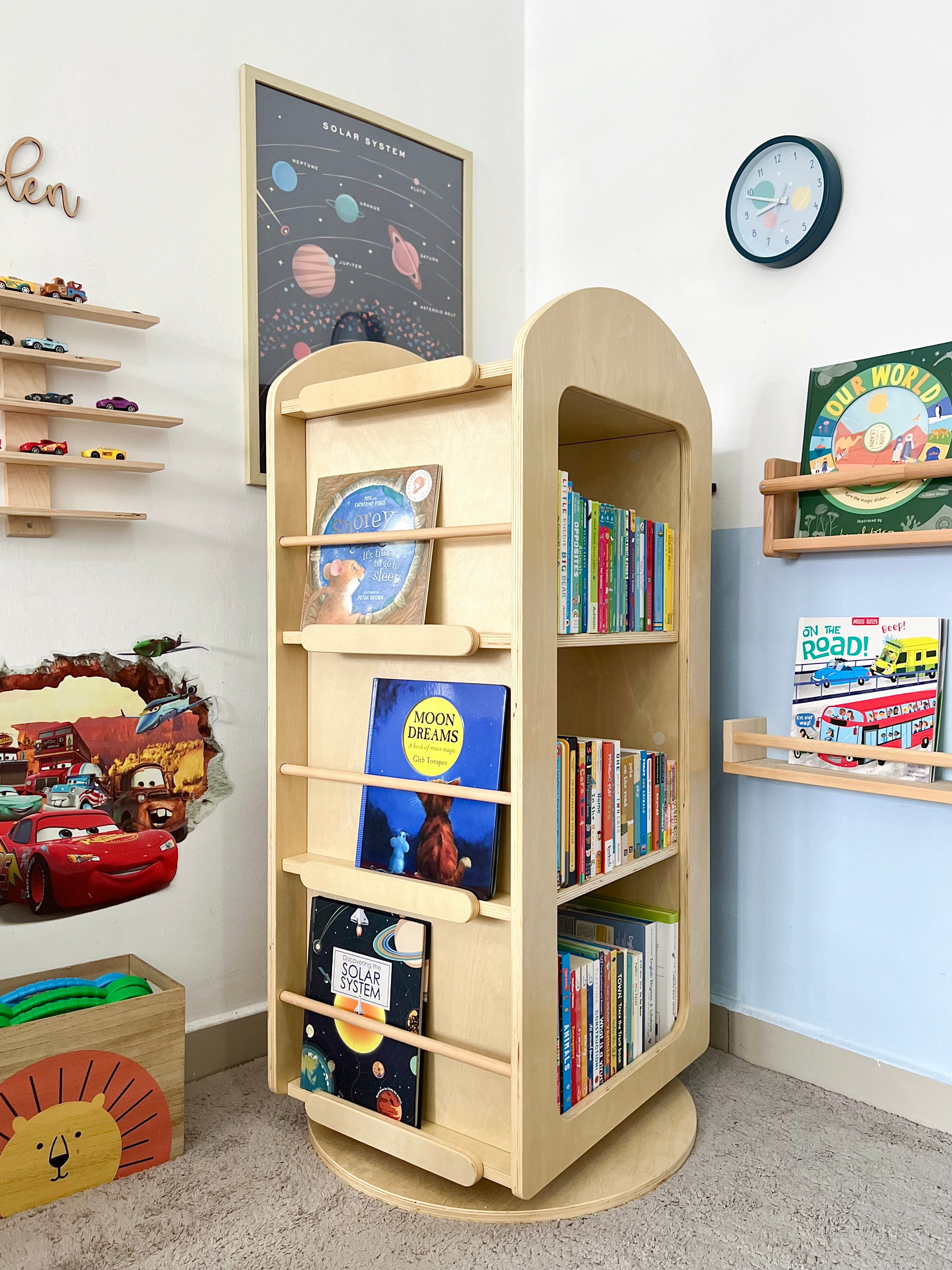 Introducing the Leo Library Revolving Bookshelf, your new 360 degree home library. With its innovating revolving design and accessible height, children can easily explore books, creating a captivating reading experience unlike any other.
